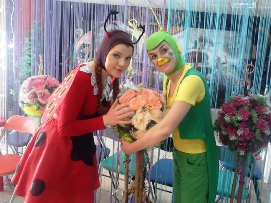 Персонажи: кузнечик Кузя и божья коровка Мила